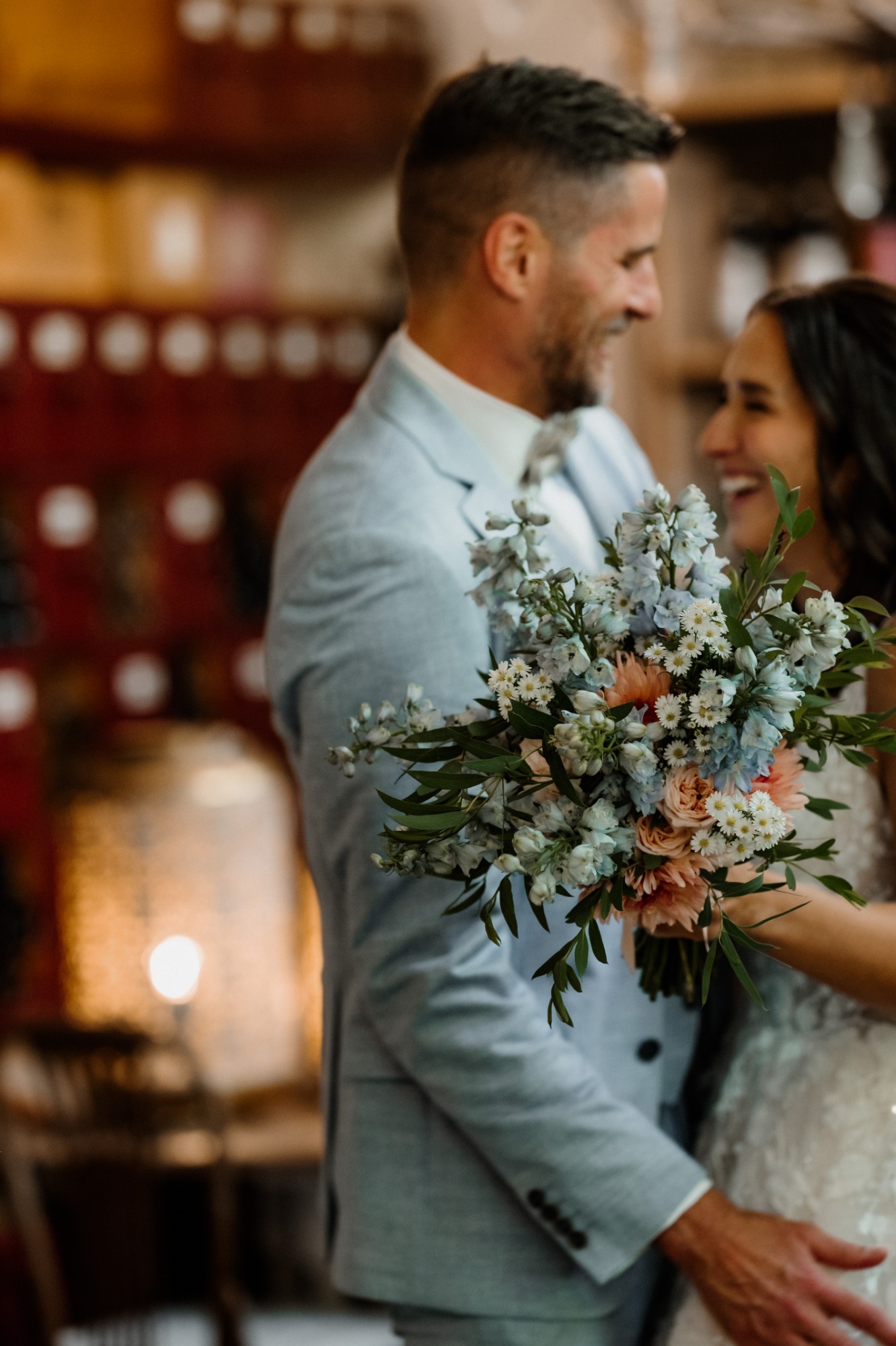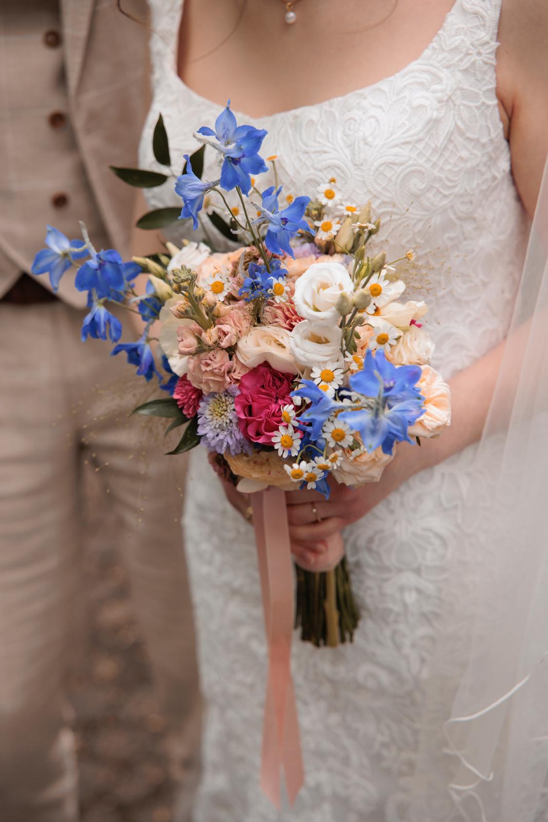 Braut hält einen bunten Blumenstrauß mit blauem, rosa und weißem Blumenschmuck.
