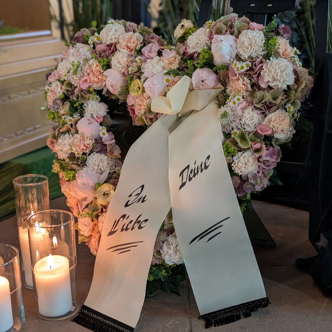 Ein Blütenkranz in Herzform mit einer Trauerschleife und Kerzen im Hintergrund.